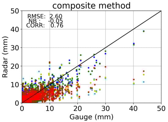 Comparison between hourly rain amounts of RG and radar rain rates. The blue, cyan, yellow, green, and red dots represent the rain rates by , , , , and the composite method, respectively.