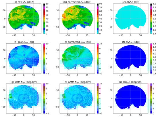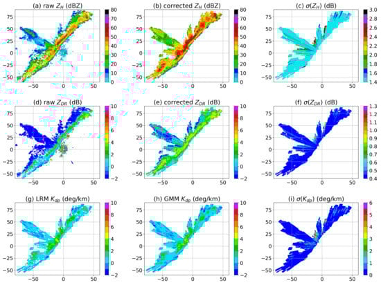 Plan position indicators (PPIs) of (a) raw , (b) corrected , (c) , (d) raw , (e) corrected , (f) , (g) LRM , (h) GMM , and (i) . The data were collected at 0411 UTC on 7 March 2017. The axes are in kilometers from the radar.