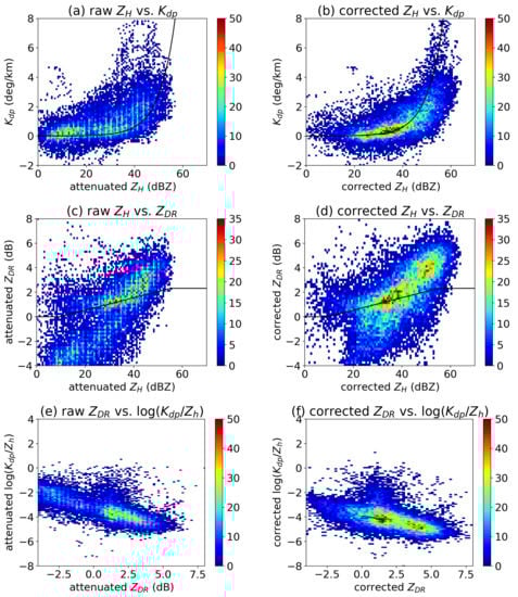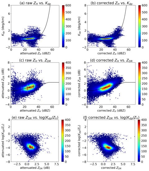 To give a further evaluation of the attenuation correction, the corrected and are compared to the self-consistency relations of , , and [,,,,]. Self-consistency relations are related to the drop size distribution []. In this study, we adopt the Pruppacher–Beard linear fit [], yielding the following relations for the X-band radar:
