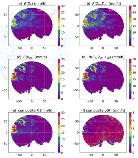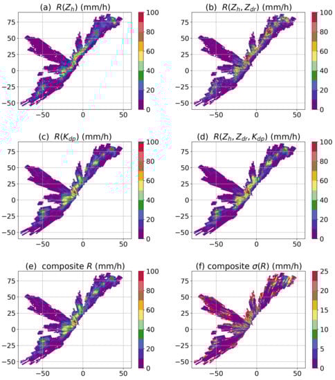 It can be seen that this method uses the statistical errors as a function of range gates to yield the variability of R. The previous research often analyzes the errors of , , and from a view of signal processing [], leading to a constant except for . In this study, we also consider the propagation of the statistical uncertainties of , , and in the rain rate estimation. To determine the coefficient in Equation (48), it is straightforward to set as the value of if the corresponding algorithm has the smallest weighted by the absolute values of the polarimetric values. Therefore, the composite method selects the rain rate with the smallest as derived from the four algorithms: