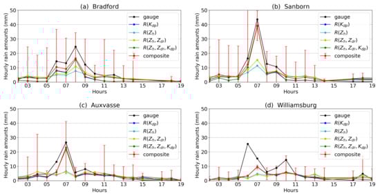 To give a further assessment, Figure 9 illustrates the statistical uncertainties (error bars) associated with the composite method. By briefly glancing at the time series, it is apparent that there are considerable variations in s at the four sites between 02 and 19 UTC. At Bradford (Figure 9a), remains large in most of the times, and then gives a moderate increase at 06 UTC, reaching about 25 mm. Standing a similar trend, at Sanborn (Figure 9b) peaks at the same time, but it has even larger magnitudes when compared to Bradford. Furthermore, the average at Sanborn is generally higher than the others. In contrast, at Auxvasse exhibit narrow plateaus at 06 UTC due to the steady trend at this time. In addition, there is a steady trend for s at Williamsburg (Figure 9d), with an average of a few tenths of a millimeter.