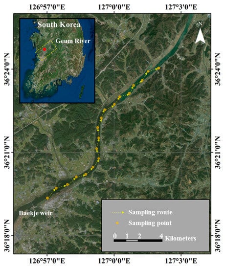 The Baekje reservoir is located at the Geum River in South Korea, particularly at the mid- western region (36° 31´ 87.75´´N, 126° 93´ 90.52´´E) (Figure 1). Baekje Weir has a length of 23 km, a basin area of 7,976 km2, and a water storage capacity of 24.2 million·m−3. Most of the water is consumed for domestic, industrial, and agricultural purposes. Recently, cyanobacterial blooms have been occurring at Baekje Weir during summer, mainly due to the excessive nutrient supply from non-point sources including soil erosion and runoff from livestock farms, as well as rural and domestic wastes [].