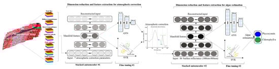 Stacked encoder with fine tunings (i.e., artificial neural network [ANN] and support vector regression [SVR]) for atmospheric correction and cyanobacterial estimation, stacked autoencoder#1 and fine tuning#1, for the water surface reflectance estimation using hyperspectral image data inputs including total flux, diffuse transmittance, direct transmittance, spherical albedo, path radiance, digital number, and point sample number, stacked autoencoder#2 and fine tuning#2 for the PC and Chl-a estimations, using atmospherically-corrected reflectance spectra.
