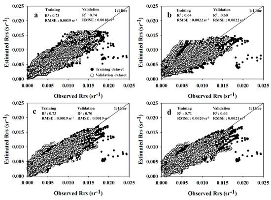 Training and validation results of the atmospheric correction: (a) SAE-ANN, (b) ANN, (c) SAE-SVR, and (d) SVR. A total of 134 observation points is presented. Each point had observed reflectance spectra with 86 bands, indicating 11,524 (i.e., 134 × 86) points, comparing the estimated reflectance spectra to the observed spectra of total bands. Black and white dots indicate training and validation results, respectively