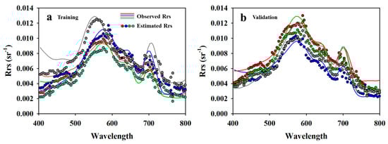Example of comparison between observed reflectance spectra and estimated spectra: (a) training result of reflectance and (b) validation result. Straight lines indicate the observed reflectance and the marks represent the estimated reflectance from SAE-ANN. For training results, four estimated and observed spectra were selected with respect to 15th point on August 12, 2016, 7th point on September 20, 2016, 7th point on September 11, 2017, and 10th point on October 25th, 2017. For validation results, four estimated and observed spectra were selected with 13th point on September 20, 2016, 20th point on October 14, 2016, 7th point on September 15, 2017, and 1st point on October 25, 2017.