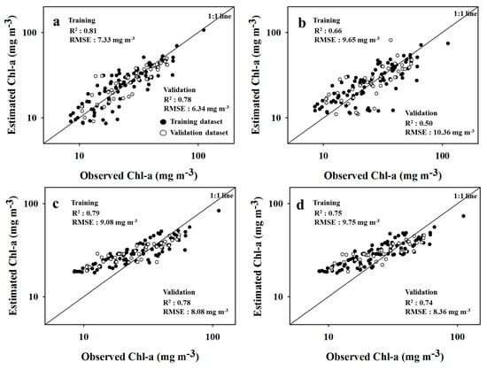 Training and validation results of Chl-a estimation, (a) SAE-ANN, (b) ANN, (c) SAE-SVR, and (d) SVR. Black and white dots represent training and validation results, respectively.