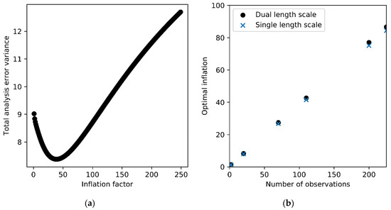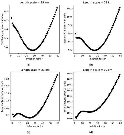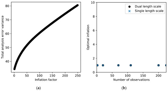 Idealised tests were conducted to determine what the inflation factor should be and how it should be applied. It was found that in some regions the optimal inflation factor varies linearly with the number of observations present. This result could be seen as intuitive—the more observations are present, the greater the effect of ignoring correlated errors, and the higher the inflation needed to counteract the overuse of observations. However, this result was not always applicable to areas where the observation error correlation length scale was less than that for the background errors (known as the ratio condition). Theoretically, applying inflation elsewhere could lead to unpredictable results and a degraded analysis.