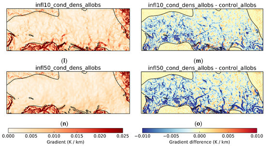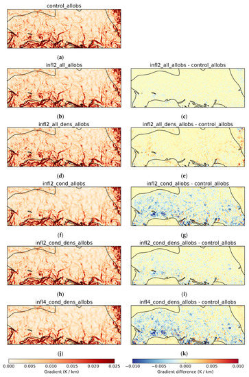 Figure 6. The left column shows an example of the gradients in that region for the cases where all observations were used, and the right column the differences in gradients compared to the control trial. The black contour gives an indication of where the ratio condition is met.