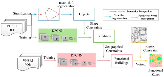 In detail, we independently built a deeper-feature convolutional neural network (DFCNN) to extract more and deeper semantic information, and buildings were extracted by DFCNN at the object level from VHSRI. Then, when integrating remote sensing images and POI data, the spatial distribution and functional semantic information of buildings were comprehended in the context of social functions. Finally, to ultimately recognize urban functional zones, regional voting was conducted on buildings by interweaving the physical semantics and the social functional semantics.