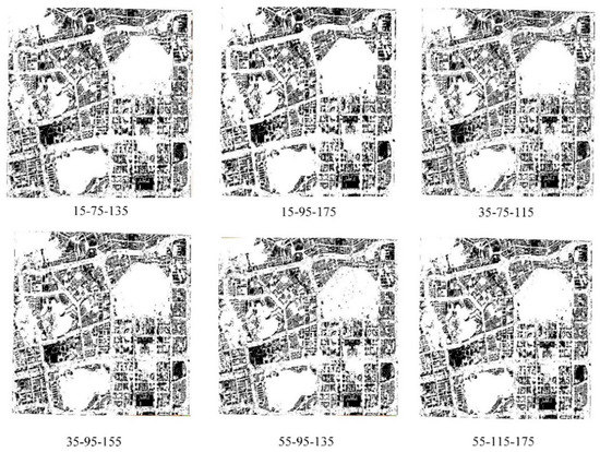 In the area, the same types were classified in to different categories and scattered, and the originally homogeneous patch was “broken”, looking like TV snowflakes. This phenomenon is called the “salt and pepper effect”. As shown in Figure 13 and Figure 14, especially for small-scale results, there are obvious salt and pepper effects (scale 15 and scale 35). With the increase in the scale, this phenomenon gradually weakens, and the classification accuracy of geographic objects and the accuracy of building extraction gradually increases, and then decreases. When the scale was 155, the recognition of building accuracy was the best, which was 97.0%. Figure 15 shows the overall accuracy of geographic objects classification and the recognition accuracy of buildings.