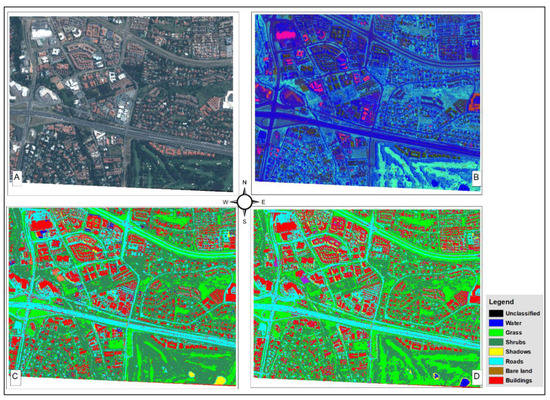 The classification results of the CMPs and MMPs algorithms in a different area (Sunninghill): (A) original Pleiades imagery; (B) filtered imagery using MP; (C) CMP classified imagery; (D) and MMP classified imagery.