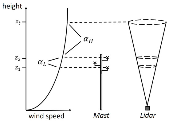 - Average PLEOne of the main issues of a mast-based extrapolation using the power law is that the measured often does not reflect the wind shear above the mast top accurately (i.e., in Figure 1). When a short-term lidar measurement is carried out next to the mast, the power law exponent in the height range between the mast top and the target height, , can be measured directly (see Figure 1). The simplest approach is to derive an average from the short-term lidar data and to use it for the extrapolation (i.e., ). The mean value of is calculated by averaging the 10-min wind speeds within the lidar measurement period and applying Equation (1). The wind shear measured in the height range of the mast is disregarded completely in this extrapolation strategy.