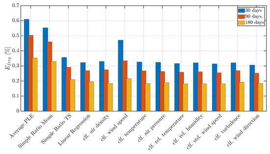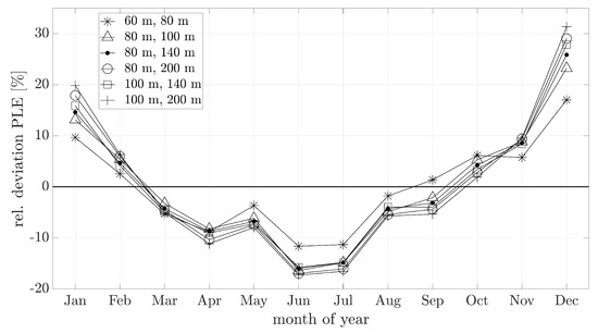 - Error in the theoretical energy production of a wind turbineThe third error score is based on the theoretical energy output of a wind turbine. A power curve of a 3.2 MW wind turbine (see [28]) is used to calculate the (theoretical) one-year energy output from the extrapolated and the reference wind speed time series at the target site. This power curve has a cut-in wind speed at 2 m/s and reaches the nominal power at 14 m/s. At wind speeds of more than 25 m/s, no energy is converted (cut-out wind speed). The energy values related to extrapolated and reference data are then compared (relative deviation) resulting in the error score .
