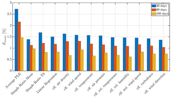 - Classification ApproachAs will be shown in Section 4.2, varies in time and can not be considered as a constant parameter. In the fourth approach, therefore, additional climatological variables are included in the extrapolation process which are expected to correlate with the temporal variation of . This is done by binning the measurement data with respect to atmospheric variables which are measured on site. Within each bin, one set of and is derived. In the extrapolation period, the values of and are chosen according to the respective value of the classification variable at the corresponding timestamp. Hence, a classified linear regression is performed.As for the Linear Regression approach, and values which were below (or above) the lowest (or highest) 5% of the values measured during the whole year were excluded from calculating the values of and in the respective bins.