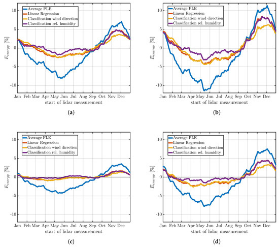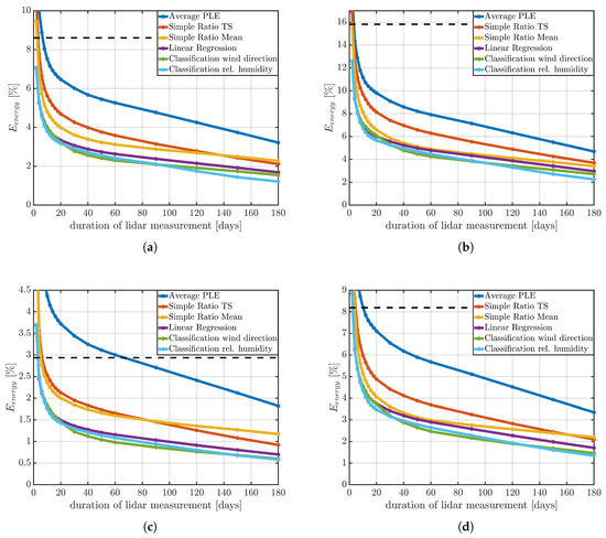 - Simple RatioThe second extrapolation strategy uses a simple relationship between the two power law exponents and and is based on work published by Lackner et al. [8]. In the simplest case, the relationship can be expressed by the ratio of the mean values of the two power law exponents, , determined in the lidar measurement period:This relationship is used to adjust the value(s) in the period in which no lidar measurement is available and extrapolation has to be conducted (extrapolation period). The corrected power law exponent is then calculated as:In contrast to Lackner et al. [8], who extrapolated yearly mean wind speeds, the analysis in this work is based on the extrapolation of ten-min wind speed values. Therefore, the method is adapted on time series in two different ways: