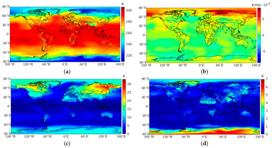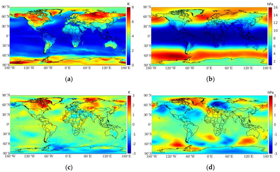 Comparison of 20 years of ERA5 surface air temperature and pressure with the modeled values using Equations (1) and (2): (a) mean RMSE for surface air temperature (K), (b) mean RMSE for surface pressure (hPa), (c) mean bias for surface air temperature (K), and (d) mean bias for surface pressure (hPa). Note that a positive bias value indicates an hourly global pressure and temperature (HGPT) model overestimation and a negative bias value indicates an underestimation.