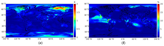Regarding the seasonal components, Figure 1c shows that the annual amplitude increased with latitude and was larger for terrestrial areas, with the maximum amplitudes in Siberia, Mongolia, northeast of China, Alaska, and north of Canada. Figure 1d shows that the amplitude of the semi-annual component was larger over terrestrial areas, reaching maximum amplitudes over the Antarctic, but it was also significant for Greenland, the African Sahel, and India (due to the monsoons). The quarterly mean amplitude had a maximum value of 2 K over Siberia, and between 1 to 1.5 K in the east of Africa, specifically Ethiopia and Somalia, in the north of Canada, Himalayas, and some parts over Antarctic (Figure 1e). This periodicity was related to the major mode of tropical atmospheric variability on intraseasonal time scales, namely the Madden–Julian oscillation (MJO) system [30]. There was a large-scale link between the atmospheric circulation and tropical deep atmospheric convection, specifically in the northern temperate and polar zones, due to variations in the (1) Arctic oscillations, (2) rainfall in East Asia, (3) North American monsoon system, (4) Indian monsoon, and (5) surface air temperature at high latitudes in the Northern Hemisphere during winter [31,32]. Southern polar zone variations in the Antarctic oscillations are also related to the MJO [33]. Including this periodicity in the model led to an RMSE improvement of between 2.5% to 5% over the mentioned areas. Globally, the mean improvement due to the quarterly signal was 0.2%.