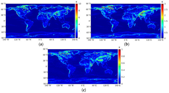 To further justify the high spatial resolution, the hourly mean maximum variability and standard deviation for each periodicity was calculated by using a window of 4 × 4 grid points, which was approximately the 1° × 1° horizontal grid that is normally adopted by other models. Figure 2 shows the maximum variability found for each amplitude. For the annual amplitude, differences up to 10 K in windows with a standard deviation of 4 K (not shown) were observed (Figure 2a). These variations were found along seacoasts, inland coasts, and around elevated areas, e.g., the Himalayas. These variations were expected in those areas due to complex weather dynamics between the ocean and land, or due to abrupt orographic changes, leading to larger temperature gradients in those areas. The semi-annual amplitude showed differences up to 3 K with a standard deviation of 1.5 K (Figure 2b). Larger values were found not only for the same places as in the annual amplitude differences, but also in elevated areas, e.g., Rocky Mountains, and near the equator, e.g., the African Sahel and northern South America. The quarterly amplitude showed differences up to 1 K with a standard deviation of 0.4 K for the same places (Figure 2c).