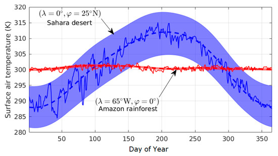 By combining the three seasonal components’ maximum values, we obtained a spatial temperature variation of 14 K inside a window of 1°. This variation could lead to a ZWD variation of up to 2.5 mm. A similar analysis was performed for the temporal resolution (not shown). We found 1-h variations up to 4 K for the annual amplitude in the west part of the United States and Canada, between 14:00 and 15:00 UTC. For the semi-annual amplitude, we found 1-h variations of up to 1.7 K over India, north of China, Mongolia, and Siberia, between 01:00 and 02:00 UTC. For the quarterly amplitude, 1-h variations reached 0.6 K over Siberia, between 21:00 and 22:00 UTC. The spatial and temporal variations found for the annual and semi-annual periodicities justified the use of the ERA5 full resolution model. It was obvious that the HGPT model not only improved the surface air temperature at seacoasts, where a considerable number of GNSS stations were available, but also the hydrological modeling at inland coasts. Considering the temperature of two locations with distinct climatological and topographical characteristics, for example, the Sahara desert (λ = 0°, φ = 25°N) and the Amazon Rainforest (λ = 65°W, φ = 0°) for a one-year time-span (2018), one can observe from Figure 3 that the time-segmentation model reproduced the diurnal cycle for both locations quite well.