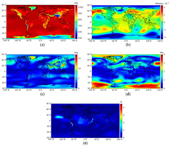 The estimated coefficients for the surface pressure are shown in Figure 4. The coefficient values were lower inland and decreased considerably as the altitude increased, reaching a minimum in the Himalayas, followed by the Andes, the Antarctic, and Greenland. The mean trend for surface pressure was negative at the polar regions and positive in temperate zones. Introducing a linear trend in the pressure model as an alternative of just using the mean pressure led to an improvement of up to 5% in the Andes region, and about 2% in the Pacific and Atlantic Oceans, as well as some regions of Africa (Figure 4e). The mean annual amplitude was larger than 15 hPa in Greenland and parts of Asia, Australia, and some parts of the Antarctic (varies between 5 and 10 hPa), reaching a minimum near the equator. The mean semi-annual amplitude reached up to 4 hPa in the Antarctic and the southern and northern Pacific Ocean. To justify the high spatial and temporal resolutions, we performed the same analysis as described previously.