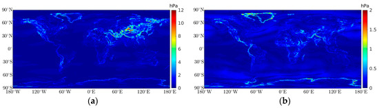 Figure 5 shows the maximum variability found for each amplitude. For the annual amplitude, we found differences of up to 12 hPa in windows with a standard deviation of 4.5 hPa (not shown). Most of these variations can be seen in Asia in the boundaries between plain and elevated areas. The semi-annual amplitude variations reached up to 2 hPa with a standard deviation of 0.5 hPa, which were located at seacoasts, mainly in the Antarctic and Greenland. Combining these differences could lead to variations of up to 32 mm in the ZHD using the Saastamoinen formula. Regarding the temporal resolution, we found 1-h variations for the annual amplitude of up to 1 hPa in some parts of Asia, the African Sahel, and in the Pacific Ocean between 09:00 and 10:00 UTC. The 1-h variations for the semi-annual amplitude reached 0.5 hPa in several locations, such as south of Africa, west of the United States, and in the southern Atlantic Ocean, for the same period.