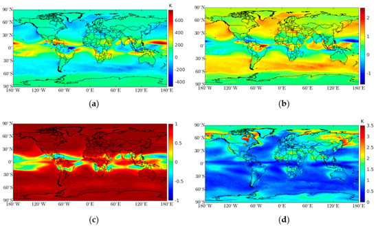 and regression coefficients, obtained using 20 years of monthly ERA5 data, which were used to estimate the weighted mean temperature () from the surface air temperature (). (c) Pearson correlation coefficient between the obtained using ERA5 numerical integration at each grid point and . (d) RMSE between obtained using , , and , and the obtained using ERA5’s numerical integration (see Equation (5)). The estimation of the coefficients in the tropic regions could generate artefacts, especially over the sea, when did not vary over a range large enough to get a satisfactory estimation of the parameters.