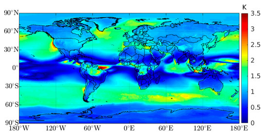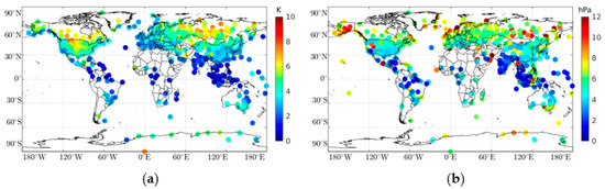 Yang et al. [23] compared five different models with distinct global temperature and pressure factors. The best global performance was achieved by a similar time-segmented model, fixing a 2-h temporal resolution and a 2.5° × 2° horizontal grid, obtaining a global RMSE of 2.95 ± 2.79 K and 7.87 ± 7.17 hPa for temperature and pressure, respectively. Comparing these results with the results of our study, we obtained an improvement of about 4% in the temperature estimation (from 2.95 ± 2.79 K to 2.85 ± 1.55 K) and about 18% in the pressure estimation (from 7.87 ± 7.17 hPa to 6.45±2.8 hPa). The ZHD can be predicted with a significant accuracy using the Saastamoinen model if accurate surface pressure measurements are available. A global standard deviation of 4.7 hPa was obtained from the difference between the HGPT model and the radiosonde observations. Appling the error propagation law to Equation (3), ignoring any possible errors in the latitude and height of each radiosonde station (Figure 8b), and adopting = 4.7 hPa, we obtained a ZHD global uncertainty of about 10 mm. Around 15% of the stations showed a standard deviation equal or lower than 0.5 hPa, leading to a ZHD uncertainty of about 1 mm. In a similar analysis for temperature, we found a global standard deviation of 1.5 K, and assuming there was no error in and (see Equation (6)), we obtained a global uncertainty of 1.1 K with a maximum value of 3.5 K over the Atlantic Ocean, close to the Amazon Rainforest (Figure 9).