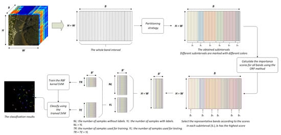 An HSI can be regarded as a data cube containing three dimensions, denoted as , where H and W represent the two spatial dimensions of the scene, and B represents the spectral dimension. Therefore, the HSI contains pixels, where each pixel contains B bands. In a supervised hyperspectral classification task, a pixel represents a sample that records the spectral information of a ground object. Generally, we need to reduce the dimensionality of the data before classification. The band selection method can be regarded as selecting the most representative bands to form a new, low-dimensional data cube, denoted as . In band selection methods, the selected band subset is required to have rich information and low redundancy. In the original Relief-F (ORF) method, the bands are sorted according to their calculated importance scores and the top k bands are selected to form a new data set to achieve data dimensionality reduction. However, ORF can only guarantee that the information on the data is rich. According to our research, it is easy to obtain adjacent bands using ORF, but the adjacent bands may be highly correlated. Therefore, in this paper, we propose an improved Partitioned Relief-F (PRF) method for band selection of HSIs. We can reshape the three-dimensional cube into a two-dimensional matrix, (), where each column is a band of the entire HSI, and all B bands can be regarded as one interval. In PRF, a partitioning strategy is proposed to divide the entire interval, in an orderly manner, to obtain multiple sub-intervals. The importance score of each band is calculated by ORF, and the band with the highest score is selected as the representative band of each sub-interval. As the partitioning strategy brings together highly correlated bands, the new low-dimensional data composed of bands selected from different sub-intervals would have lower redundancy. Additionally, as SVMs perform well on small sample data sets [], we chose an RBF-kernel SVM as the final classifier to address the reality of the high cost of HSIs. The details of the proposed method are described in Section 3, and Figure 1 can be used as a reference for the entire model.
