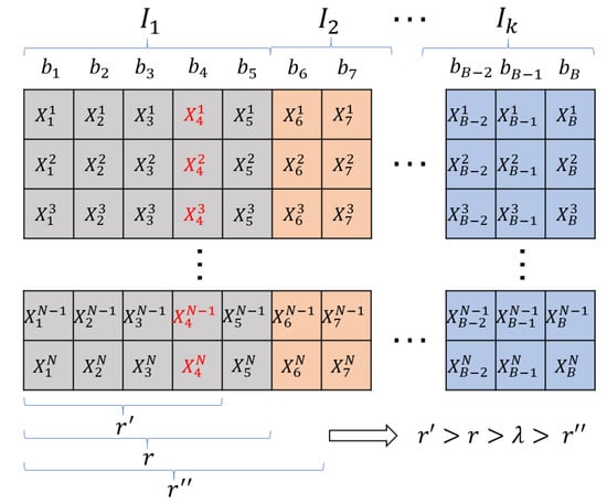 The graphical interpretation of the proposed partitioning strategy is shown in Figure 2. For the two-dimensional matrix , where each column represents a band, each row records the spectra of a single pixel, and is the measured value of the pixel in the band. Assuming that the first sub-interval contains five bands (i.e., ), as shown in the gray part in Figure 2. Let represent the redundancy of , r represent the redundancy of , and represent the redundancy of . According to the description of the partitioning strategy, we have , where is the pre-set threshold. Thus, is actually the condition for the current sub-interval to stop dividing; when this condition is met, the division of the next sub-interval starts. For the obtained sub-interval, a representative band can be obtained according to the band importance score. Assuming that has the highest score in , it will be selected as one of the representative bands used to form a new low-dimensional data set.
