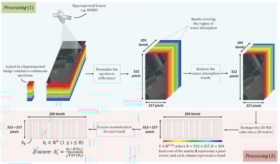 Although the three data sets were collected from different scenes using different hyperspectral sensors, the processing done on them was similar. As shown in Figure 3, “Processing (1)” was the processing performed during the period from data collection to public access. First, the spectra of the HSI acquired by the hyperspectral sensor was normalized to reflectance. Then, the water absorption bands and/or the low SNR bands in the obtained HSI cube were eliminated. According to the information provided by the sources of the data sets, only the water absorption bands were removed in the Salinas data set, no bands were removed in the PaviaU data set, and the water absorption bands and low SNR bands were removed in the KSC data set. Figure 3 uses the Salinas data set as an example. It can be seen that, after 20 water absorption bands are eliminated, 204 bands are left in the data set. “Processing (2)” is the processing performed in this paper. First, the three-dimensional data cube is reshaped into a two-dimensional matrix, , where and . Then, the values of each band are standardized using Equation (20), such that the bands follow the standard normal distribution. In fact, the data processing flow also includes a third stage, which is the dimensional reduction using PRF and the division of the training and test sets. This stage is shown in the model structure diagram, Figure 1.