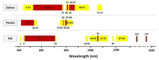 After calculating the importance scores of each band in the original data set, select the top k bands to form a new, lower-dimensional data set (which is the general processing of the ORF method). When the dimension of an HSI is required to be reduced to 30 dimensions, the 30 bands with the highest importance scores are selected. The indices of the obtained 30 bands are shown, marked with red, in Figure 4. It can be seen from the figure that most of the top 30 bands are in continuous arrangement, which was the case for all three data sets. Taking the Salinas data set as an example, the top 30 bands were 13–36, 41, and 43–47. The specific ranking of these 30 bands and their corresponding importance scores are shown in Table 3. For generality, Figure 4 also shows the indices (marked in yellow) of the bands with importance scores ranking from 31 to 60. It can be seen that, in the three data sets, most of the bands with scores ranging from 31 to 60 were still continuously arranged. In summary, most of the top k bands obtained by the general processing of the ORF are arranged continuously. The main reason for this may be that HSIs acquire narrow spectral bands over the continuous spectral range, such that the measured values between adjacent bands are similar.