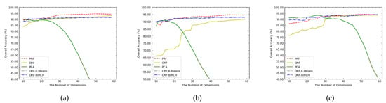 The clustering process on bands is similar to the partitioning strategy in PRF, where the clusters obtained by the clustering algorithm is similar to the sub-intervals obtained by PRF. Therefore, we chose two clustering algorithms, K-Means and BIRCH, to compare with the proposed partitioning strategy. Both the K-Means and BIRCH algorithms need to specify the number of clusters in advance, and the representative bands are selected from each cluster, where the representative bands are also obtained based on the importance scores. Therefore, the band selection methods based on these two clustering algorithms are denoted as ORF-K-Means and ORF-BIRCH, respectively. The five methods, ORF, PCA, ORF-K-Means, ORF-BIRCH, and PRF, are examined for the situation that the effect of dimensionality reduction changes with an increase of the number of bands, as shown in Figure 5.