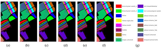 Classification maps for the Salinas data set obtained by different methods: (a) PCA; (b) ORF; (c) ORF-K-Means; (d) ORF-BIRCH; (e) PRF. In addition, (f) is the ground truth, and (g) is the legend.