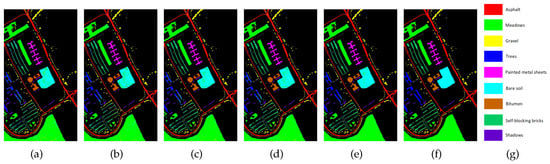 Classification maps for the PaviaU data set obtained by different methods: (a) PCA; (b) ORF; (c) ORF-K-Means; (d) ORF-BIRCH; (e) PRF. In addition, (f) is the ground truth, and (g) is the legend.