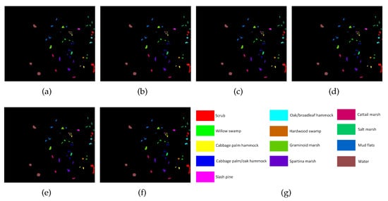 Classification maps for the Kennedy Space Center (KSC) data set obtained by different methods: (a) PCA; (b) ORF; (c) ORF-K-Means; (d) ORF-BIRCH; (e) PRF. In addition, (f) is the ground truth, and (g) is the legend.