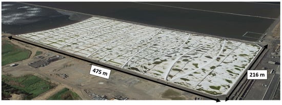 Melbourne Water Corporation’s (MWC) Western Treatment Plant (WTP) at Werribee, Victoria, Australia is a large wastewater treatment facility, see Figure 1. WTP treats more than 50% of Melbourne’s sewage via a combination of lagoon systems and activated sludge plants. WTP includes two deep, 9.7-hectare, covered anaerobic lagoons (CAL) [] where the raw sewage is broken down via anaerobic digestion. These lagoons are covered by high-density polyethylene (HDPE) membrane [,]. The membrane that floats on the wastewater, also called a “floating cover”, helps to provide an anaerobic environment for the bacteria to digest the organic material in sewage and to produce methane-rich biogas. The floating cover performs the function of capturing odor and greenhouse emissions from these lagoons. Each floating cover captures up to 65,000 m3 of biogas per day, which is then used to generate up to 7 MW of electricity.