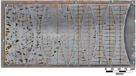 The orthophoto of the monitored CAL at the WTP is shown in Figure 2. The dimension of the floating cover over this lagoon is 475 m × 216 m. A total of eight ground control points (GCPs) were marked on the concrete area around the anaerobic lagoon. A Global Navigation Satellite System (GNSS) RTK rover from Leica GS18 T model (using SmartNet CORS network) was used to measure the location of the GCPs twice for 180 seconds and averaged. The accuracy of GCPs measurement typically (at worst), due to GDA94 and AusGeoid09, is 20 mm horizontal and 30 mm vertical []. By considering the redundancy, a Hex Rotor UAV - DJI M600 Pro with Zenmuse X5 (15 mm lens) [], see Figure 3a, was utilised to conduct the UAV survey over the floating cover of this lagoon. A total of six drone surveillances were conducted over a period of 10 months. The details of each flight, or UAV RTK mapping survey, are listed in Table 1. WTP mandates a minimum flight elevation of 20 m from the surface of the covers for safety reasons. A trained and licensed UAV pilot used Pix4DCapture [] to configure a single grid flight path with more than 70% overlap at 50 m above ground level over the floating cover. Each UAV RTK mapping survey took approximately 30 min.