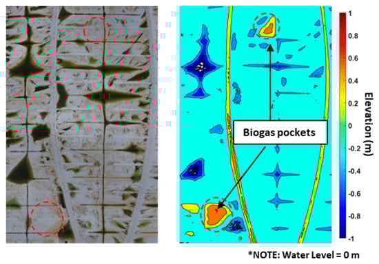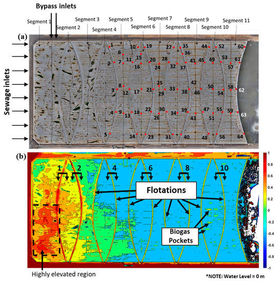 The constructed DEM shows that the covers at the regions in the vicinity of the sewage inlet are highly elevated (large red patches), especially along the middle and bottom sections of Segment 1 (see Figure 5b). These highly elevated regions could potentially be due to the accumulation of buoyant hard scums. In addition, there are multiple biogas pockets (small yellow patches) can also be noted along Segment 10, see Figure 5b.