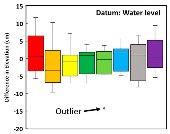 As there is no geo-tag on the results obtained from the levelling survey by MWC’s contractor, an averaged elevation of 10 × 10 pixels at the points in the constructed DEM were compared. For comparison purposes, the same datum, Point 33 (water level) as identified in the DEM, is set as the water level for the constructed DEM. The elevation obtained from constructed DEM (Figure 5b) was compared with the elevation obtained from the survey level. These results are shown in Table 3 and plotted graphically in Figure 6. The difference in measurement has a range of 0.26 m (−0.14 m to 0.09 m) with a standard deviation of 0.05 m. The largest difference in elevation between both measurement methods measured at Point 36 in Segment 8 is −0.14 m. Figure 6 shows that Point 36 is an outlier, which is outside the range of ±1.5 × IQR (Interquartile range). The error can be due to human error (choosing the wrong points for comparison) and it could be due to the change in condition (as both surveys were not conduct on the same day). Nevertheless, the accuracy of the DEM is evident and 71% of the error between the two measurements are within ± 0.05 m, which is small compared to the length-scale expected. The finding highlights the reliability and the confidence of using the constructed DEM to assess the floating cover.