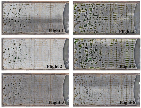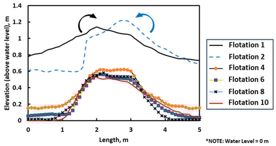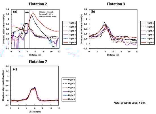 Figure 12 also shows that there is a change in elevation in the middle region of flotation 2 as indicated in Flight 5 – 1. For verification purposes, the time-lapsed elevation profiles along with Flotations 2, 3, and 7 as indicated in Figure 12 (Flight 4 – 1) are plotted in Figure 13 (a–c) respectively. Figure 13a shows that flotation 2 was initially at 0.4 m above water level (Flights 1 to 4) and subsequently increased to 0.7 m above water level (Flights 5 and 6). The increase of 0.3 m in elevation indicates that the scums have been accumulating or moving beneath the cover to elevate the flotation 2 and the floating cover at this region. The flotation is also displaced to the right by 1.5 to 2 m and rotated anticlockwise (with difference in elevation of 0.2 m), see Flight 5 and 6 in Figure 13a. This can impose a significant amount of localised stress on the cover.
