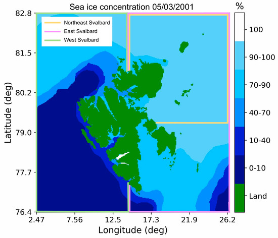 Sea ice concentration maps (hereafter, SIC) in the Arctic sea are available via OPeNDAP for the period 1967–present and are produced by the Norwegian Meteorological Institute. Ice charting has been carried out manually by GIS (Geographic Information Systems) experts [45]. Currently, the data are available on a daily basis and cover a latitude range from 53.8–88.8°N and longitudes from −84.0 to 87.2°E. During the ice charting procedure, ice types are classified into different classes depending on the ice concentrations. The SIC limits and ice type definitions used in the classification can be found in Table 2 of Dahlke et al. [46]. We accessed the SIC map catalogue [47] using OPeNDAP to extract SIC maps of the sea region around Svalbard from 2000 until 2019 in order to investigate whether there are observable correlations between the timing of snow disappearance and sea ice concentration. An example of the data product extracted from the catalogue is shown in Figure 3 for 5 March 2001. We used the SIC classifications of Dahlke et al. [46] to define the color scale used in Figure 3. This subregion of data was further divided to calculate the mean daily ice concentration over four different sea areas surrounding Svalbard in order to investigate whether the region where sea ice is present influences the timing of snow disappearance and, if so, which area of sea has strongest influence. These four areas comprise the sea to the northeast, east and west of Svalbard, plus averaging over the entire sea region surrounding Svalbard. The boundaries of the areas used for averaging SIC are indicated in Figure 3. For each sea region, we smoothed each year of ice concentration measurements with a median filter of 15-day width to remove short-lived fluctuations. The smoothed time series were then temporally averaged over all years in the dataset, for each day of the year.