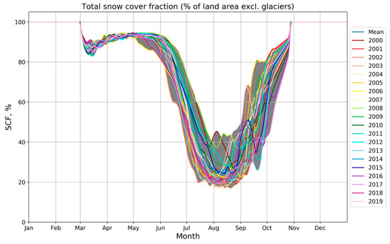 The total (land-averaged) SCF for Svalbard for all 20 years in the time series is shown in Figure 4. It can be seen that the variability in total SCF is greatest during the summer period from July to the end of September. The SCF converges to a minimum value of close to 20% for the majority of years in the time series, but SCF did not fall below approximately 40% during a few years (most notably 2000 and 2008) due to late season snowfall in August over the northernmost areas of Svalbard.