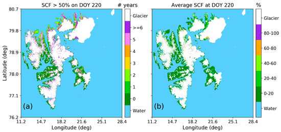 The average date of the minimum SCF occurs on 8 August (DOY 220), with an average snow cover fraction of 27.4%. The number of years where the SCF exceeded 50% on 8 August is illustrated in Figure 5a, while the snow cover fraction on 8 August is mapped in Figure 5b. Figure 5b therefore allows the areas that contribute most to the land-averaged minimum SCF remaining above 20% during the period studied (Figure 4) to be identified. While Figure 5b shows that there are large parts of the archipelago that are close to snow-free (<20%), there is a clear tendency towards higher minimum SCF in the northernmost areas on Spitsbergen and Nordaustlandet. These areas are fully or close to fully snow covered in August for many of the years during the study period. In particular, the years 2000 and 2008 experienced late snowfalls in July/August, which resulted in large areas that never became snow-free (SCF < 50%). The same areas retain high minimum SCF for more than 5 years of the 20-year time series. Hence, when SCF is averaged over the entire archipelago, the land-averaged minimum SCF never falls to zero due to these areas with persistent snow cover.