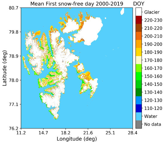 Since we wish to study the relationship between snow disappearance and timing of growing season onset, and between timing of snow disappearance and sea ice concentration, we will mainly focus on the results of the spatial patterns in FSFD in Section 3.2 and Section 3.3. The mean date of the first snow-free day, averaged over the entire period 2000–2019, is shown in Figure 6. The land-averaged date for FSFD is DOY 180 (29 June) ± 17.8 days. It can be seen from this figure that there are clear north–south variations as well as variations with elevation. In the northern- and easternmost areas of the archipelago for example, the mean date for FSFD is typically after DOY 190, or mid-July, while over Nordenskiöld Land it can be seen that the low-lying valley areas exhibit a mean FSFD of DOY 130–170, which is one to one and a half months earlier than compared with the northern parts of the archipelago. In the mountainous regions over Nordenskiöld Land, FSFD occurs as late as the lower lying areas of the northern parts of the archipelago.