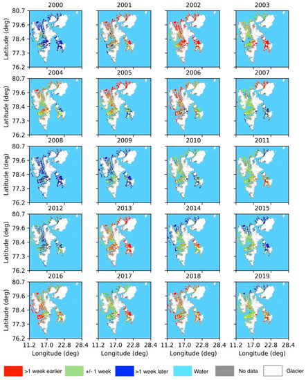 Anomalies in FSFD for each year are shown in Figure 7. These have been calculated by subtracting the individual pixel values of FSFD from the 2000–2019 average FSFD. The anomalies, or differences from the 2000–2019 average have been categorized into either >1 week earlier, ±1 week change or >1 week later in order to identify years where the timing of snow disappearance occurred much earlier or much later than the 20-year average. Figure 7 shows that 2000, 2008 and 2009 stand out as years where the FSFD occurred much later than average over the whole archipelago, while in 2002 and 2013 the timing of FSFD was much earlier than the 2000–2019 average. During other years in the time series, the timing of FSFD was either later or earlier than the average for different parts of the archipelago. For example, in 2007, FSFD occurred >1 week earlier than average on Nordaustlandet in the northeast part of the archipelago, while on Edgeøya FSFD occurred >1 week later than average, even though it can be seen from Figure 6 that the mean FSFDs for these two areas are actually very similar and quite late. In 2014, the opposite situation is observed, with Nordaustlandet and western coastal parts of Spitsbergen exhibiting FSFD which was >1 week later than average, while the timing of snow disappearance on Edgeøya occurred >1 week earlier than average.