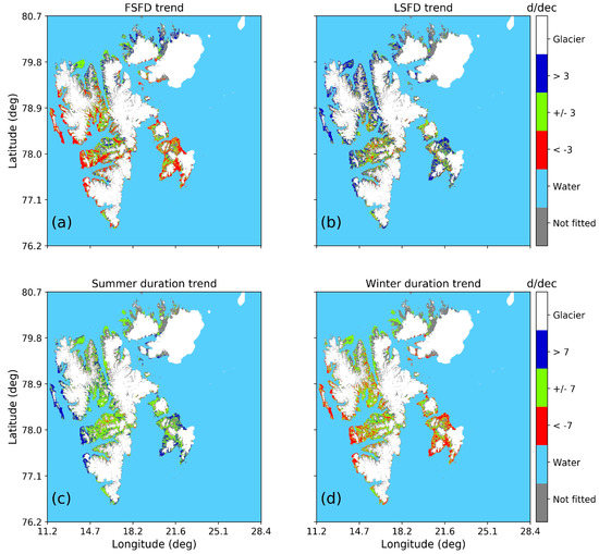 These changes in FSFD and LSFD in turn affect the length of summer and winter at different parts of Svalbard, as shown in Figure 8c,d respectively. For the entire archipelago on average, the length of summer is increasing by +4.2 days decade−1, though Figure 8c indicates that there are distinct regional variations. The greatest increases in the duration occur at the western edges of Spitsbergen, while the remainder of the archipelago exhibits an increase of up to 7 days. On Nordaustlandet the trend in length of summer is only +1.4 days decade−1, while on Edgeøya and Nordenskiöld Land the trends are somewhat stronger, with increases of +5.6 and +3.3 days decade−1, respectively. With regard to trends in winter duration, the westernmost and easternmost areas exhibit the greatest reductions, of >7 days decade−1. On Edgeøya the average trend in winter duration is −7.1 days decade−1, while the central parts of the archipelago exhibit somewhat weaker reductions of up to 7 days decade−1. On Nordenskiöld Land, for example, the reduction was on average −4 days decade−1. This contrasts with a few isolated areas in the north which exhibit an increase in the length of winter of >7 days decade−1. Averaged over Nordaustlandet, the mean trend in winter duration is a negligible +0.6 days decade−1. It should be noted, however, that a large proportion of pixels on Nordaustlandet did not possess sufficient data points in the time series for a linear fit to be made for LSFD, summer and winter duration trends, as illustrated by the grey colored pixels.