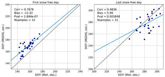 Figure 9 (left) shows that there was a significant and positive correlation between the meteorological estimate of FSFD and the MODIS estimate, with correlation coefficient of 0.77. The bias of −12.32 indicates that FSFD estimates obtained from the MODIS snow cover fraction product were on average 12 days later than those observed from the point snow depth measurements. Qualitatively, the dataset exhibits more spread in MODIS estimates when FSFD as observed from snow depth measurements occurs earlier than DOY 150 and better correlation between the two estimates when the snow depth estimate of FSFD occurs after DOY 150. In the case of LSFD, in the right panel of Figure 9, there is significantly greater scatter around the regression line, indicating less agreement between the two estimates and therefore weaker correlation, as noted from the correlation coefficient of 0.48. The regression line intersects with the equality line when the meteorological LSFD is around DOY 270; hence, when the meteorological LSFD occurs before DOY 270, the MODIS LSFD estimate is later, and for meteorological LSFD after DOY 270, the MODIS estimate LSFD is earlier.