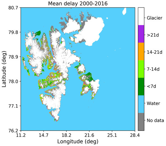 The MODIS NDSI single-day accuracy has been assessed by numerous authors on a global scale [35,36,39]. In the majority of studies, comparisons with in-situ snow depth data recorded at meteorological stations and with high resolution optical data such as those obtained by the Landsat and Sentinel-2 satellites are accepted as the best way to assess the accuracy. To assess the accuracy of interpolated gap-filled time series, the average number of days between cloud-free observations was used as a proxy for the accuracy of the interpolated snow product [19,23]. We adopted this approach to assess the uncertainty incurred in the estimates of FSFD and LSFD by calculating the number of days since the last cloud-free observation. The average number of cloud-free days for our estimates of the FSFD and LSFD are mapped for the entire Svalbard archipelago in Figure A2. Using all 20 years of the dataset, the average number of days since the last cloud-free day is 8.3 ± 3.8 days for FSFD and 7.7 ± 4.2 days for LSFD. The difference is minimal, but the number of pixels where we cannot estimate LSFD (26.0% of all land pixels for all years) is marginally higher than for FSFD (25.3%) and concentrated primarily in the northern parts of the archipelago. Hence the overall estimate of LSFD is marginally less certain over these areas than for FSFD. However, there are both large spatial and interannual variations, with some years and regions experiencing long periods of the order 1–2 months without cloud-free observations. For the meteorological sites and available years of data we used to validate MODIS FSFD (c.f. Section 2.4), the mean number of days since the last cloud-free observation for FSFD is 4.4 days, while for estimates of LSFD, the average number of days since the preceding cloud-free observation is 2.8 days.