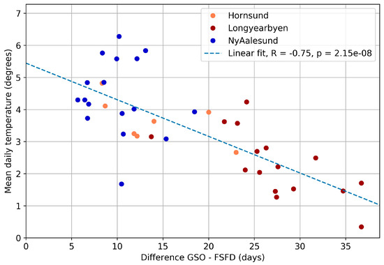 The relationship between the difference between FSFD and GSO and mean daily temperature in this period for the sites Hornsund, Longyearbyen and Ny-Ålesund is illustrated in Figure 12. Only Longyearbyen and Ny-Ålesund had complete time series for the mean daily temperature, while for Hornsund there were some years with missing temperature data. For all three sites there were complete time series of the difference between GSO and FSFD. Figure 12 indicates that occurrences of greater (smaller) differences are due to cooler (warmer) average temperatures, indicated by the negative slope of the regression line. At Ny-Ålesund for example, where the difference between snow disappearance and GSO was generally shorter (minimum = 5.2 days, maximum = 17.5 days), the mean daily temperatures are also higher (mean = 4.4 °C, variance = 1.3 °C) than at Longyearbyen (mean = 2.3 °C, variance = 1.0 °C) where the difference between FSFD and GSO was longer (minimum = 13.7 days, maximum = 36.7 days). At Hornsund, the spread in difference is quite large (minimum = 1.5 days, maximum = 22.5 days), while the corresponding mean daily temperature during the period between snow disappearance and GSO was confined to a smaller range of about 2 °C. It should be noted though, that the mean daily temperatures being compared in Figure 12 correspond to different times of year. This is because the mean FSFD at Longyearbyen typically occurs up to a month earlier than at, for example, Ny-Ålesund (c.f. Figure 6) which explains why the data in Figure 12 shows lower average temperatures for Longyearbyen despite its more southerly location in comparison with Ny-Ålesund. Despite the data points being spread about the regression line, the correlation is quite strong and negative (r = −0.75) and significant (p < 0.05). The range and mean values of the difference and mean daily temperature for the three sites are summarized in Table 3.