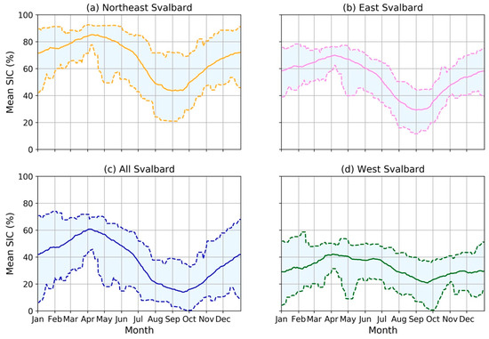 Time series of the spatially and temporally averaged SIC are illustrated for each of the four sea regions (c.f. Figure 3) in Figure 13a–d together with the minimum and maximum SIC indicated by the dashed lines. For all regions, the maximum mean SIC is reached in the beginning of April and falls to a minimum in the start of September. Similarly, for all regions, the variation is smallest between lowest and highest SIC at April maximum, while there is greatest variation between the lowest and highest values of the mean SIC at the start and end of year. The mean SIC is typically highest in the sector northeast of Svalbard, ranging from a mean minimum concentration of just over 40% to a mean maximum concentration of approximately 85%. This contrasts with SIC in the sector west of Svalbard, where warm Atlantic water is driven northwards by the West Spitsbergen Current and inhibits the formation of sea ice. As a result, SIC is overall lower compared with SIC in the east of Svalbard, with much smaller range between the mean minimum and maximum SIC, ranging from 20% to 40%.